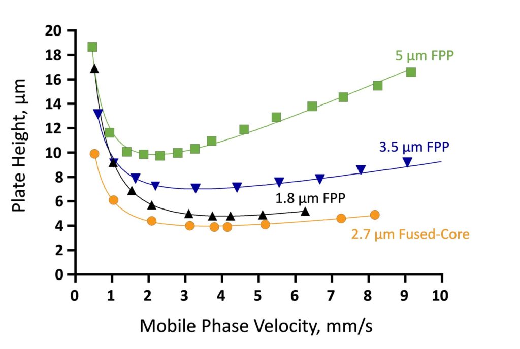 Many of the reasons for the advantages of SPP columns were misunderstood and misconstrued early on before researchers were able to study them in more detail. Originally, some thought that the improved efficiency was due to shorter diffusion distances (0.5 µm vs. ~0.9 µm for FPP sub-2-µm columns) or due to the much narrower particle size distributions that resulted from the manufacturing process used to make SPPs. Others claimed that the very narrow superficially porous particle size distributions allowed SPPs to be packed more uniformly, leading to smaller van Deemter “A-term” values due to the more uniform analyte flow paths through the columns.