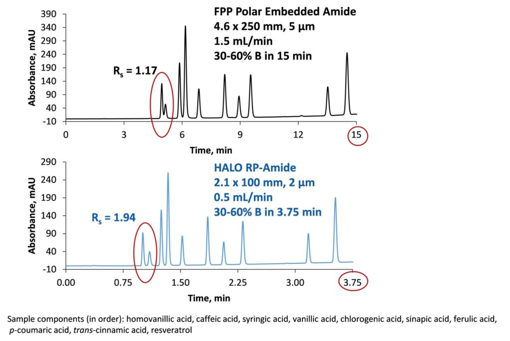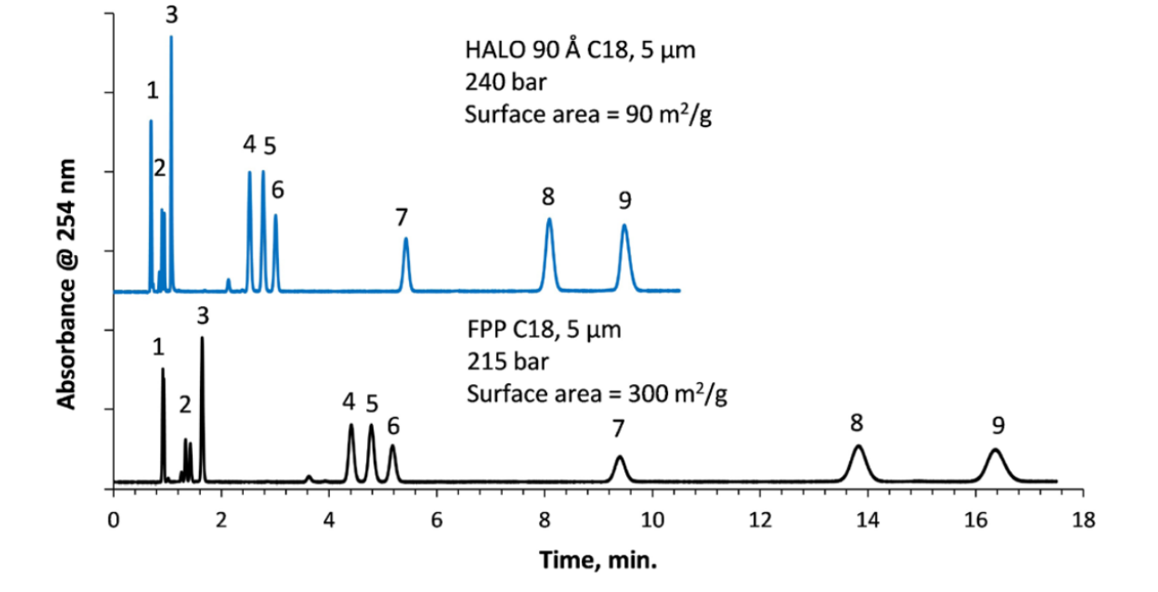 For HPLC separations, significant improvements in analysis time and resolution can be achieved using HALO® 5 µm SPP columns as shown in Figure 7.
