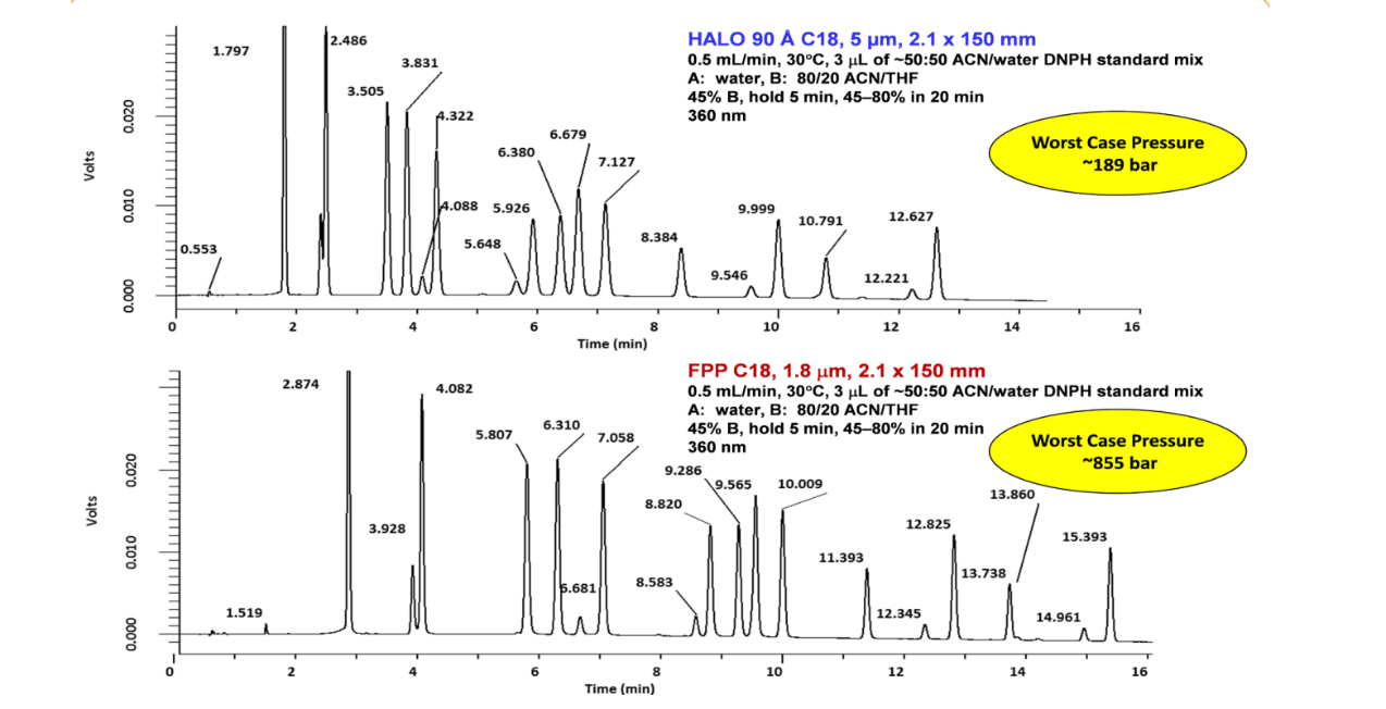 Figure 9. Comparison of Separations of Carbonyl DNPH Derivatives Using 5 µm HALO® and 1.8 µm FPP Columns Under the Same Conditions