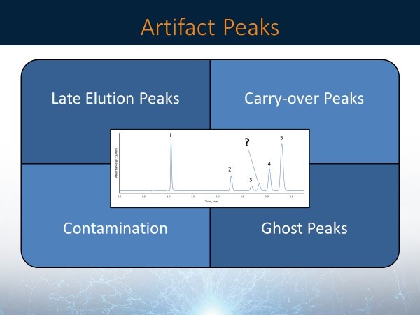Unknown peaks in the separation could be due to artifacts from the system. There are several reasons why unknown peaks can occur, and there are some troubleshooting tips to try when an artifact peak is observed. There are four main types of artifact peaks: late elution peaks, carry-over peaks, contamination, and ghost peaks (Figure 5).