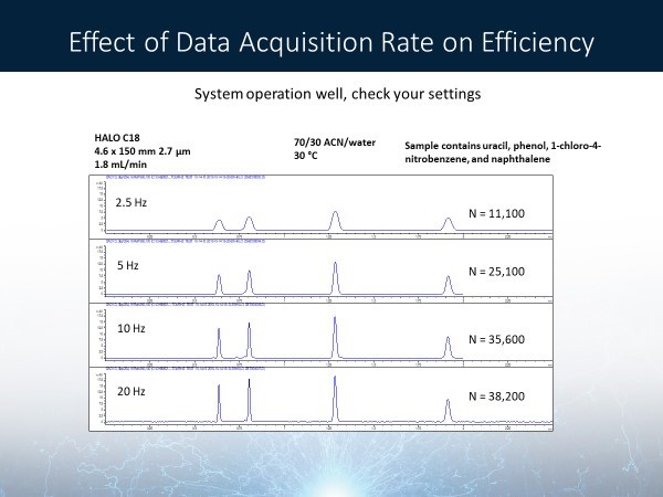 Detector settings should also be considered when noticing broad peaks and low efficiency. This could be a quick and easy change that could make a significant difference. For example, figure 3 shows a separation of neutral compounds at different data acquisition rates. Peak efficiency improves significantly as the data rate setting is increased. It is recommended to have at least a 20 Hz acquisition rate in your detector settings.