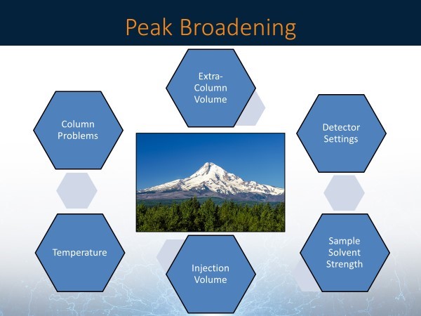 As chromatographers, we are constantly trying to get sharp, efficient peaks and baseline resolution for our separations. Peak broadening can prevent this and can be caused by a variety of reasons. Several possible causes for peak broadening are shown in Figure 2. Mobile phase temperature and sample solvent strength mismatch are also possible causes that may need to be investigated.