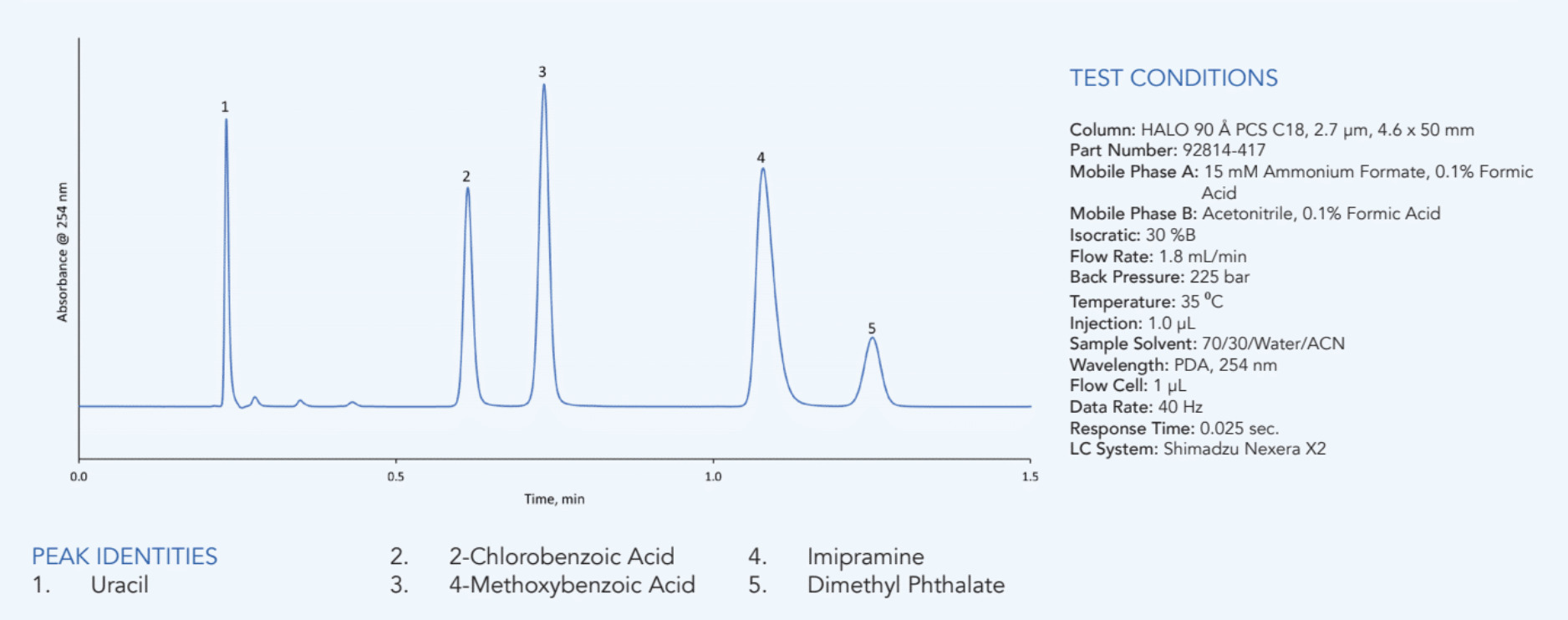 The new HALO®PCS C18 phase offers an alternative to chromatographic separations under acidic conditions. Many chromatographers are familiar with the difficulties of separating basic compounds. These compounds are troublesome and usually elute from the column with a tailed peak shape making higher loads on the column nearly impossible to deal with. With the new line of HALO®PCS C18 columns, built on Fused-Core®technology, chromatographers can trust in fast and efficient separations of basic compounds in both small molecule and biological separations.