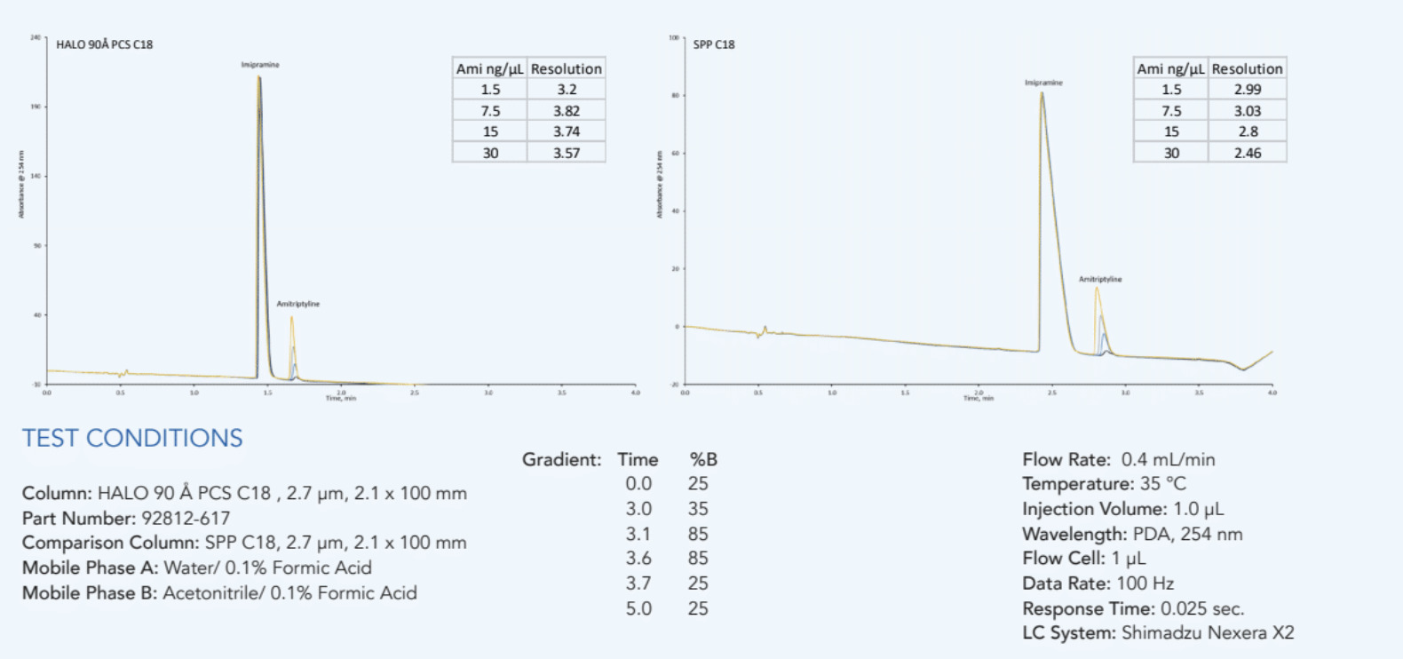 Figure 2: A separation of imipramine and amitriptyline is performed on both a HALO 90 Å PCS C18 and a SPP C18 column.