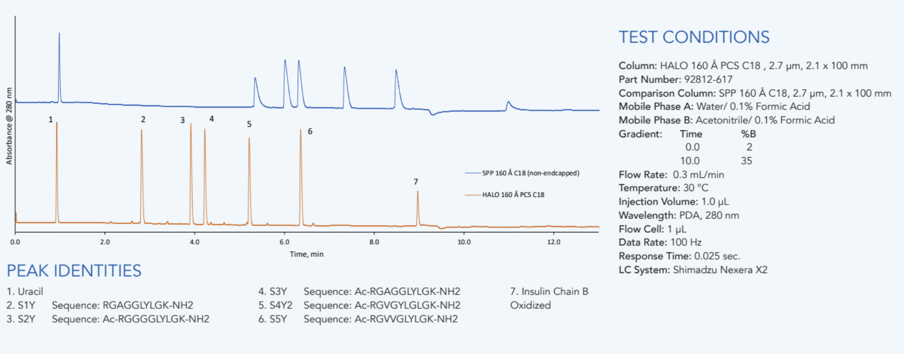 In summary, the HALO®PCS C18 stationary phase opens up options for chromatographers as a surface chemistry that can improve basic separations not only for small molecules, but for peptides as well. While peak shape will improve for these basic compounds, remember that retention may be reduced compared to standard C18 phases. This means you must be aware of how much organic will be used in each separation. HALO®PCS C18 should also be used under acidic conditions to benefit from the positively charged surface. HALO®PCS C18 is a helpful addition to MS method development, allowing for the use of formic acid, meaning higher ionization efficiencies, without sacrificing peak shape and instrument contamination. The efficiency of the Fused-Core®particle along with the utility of the HALO®PCS C18 phase deepens the chromatographer’s toolbox.